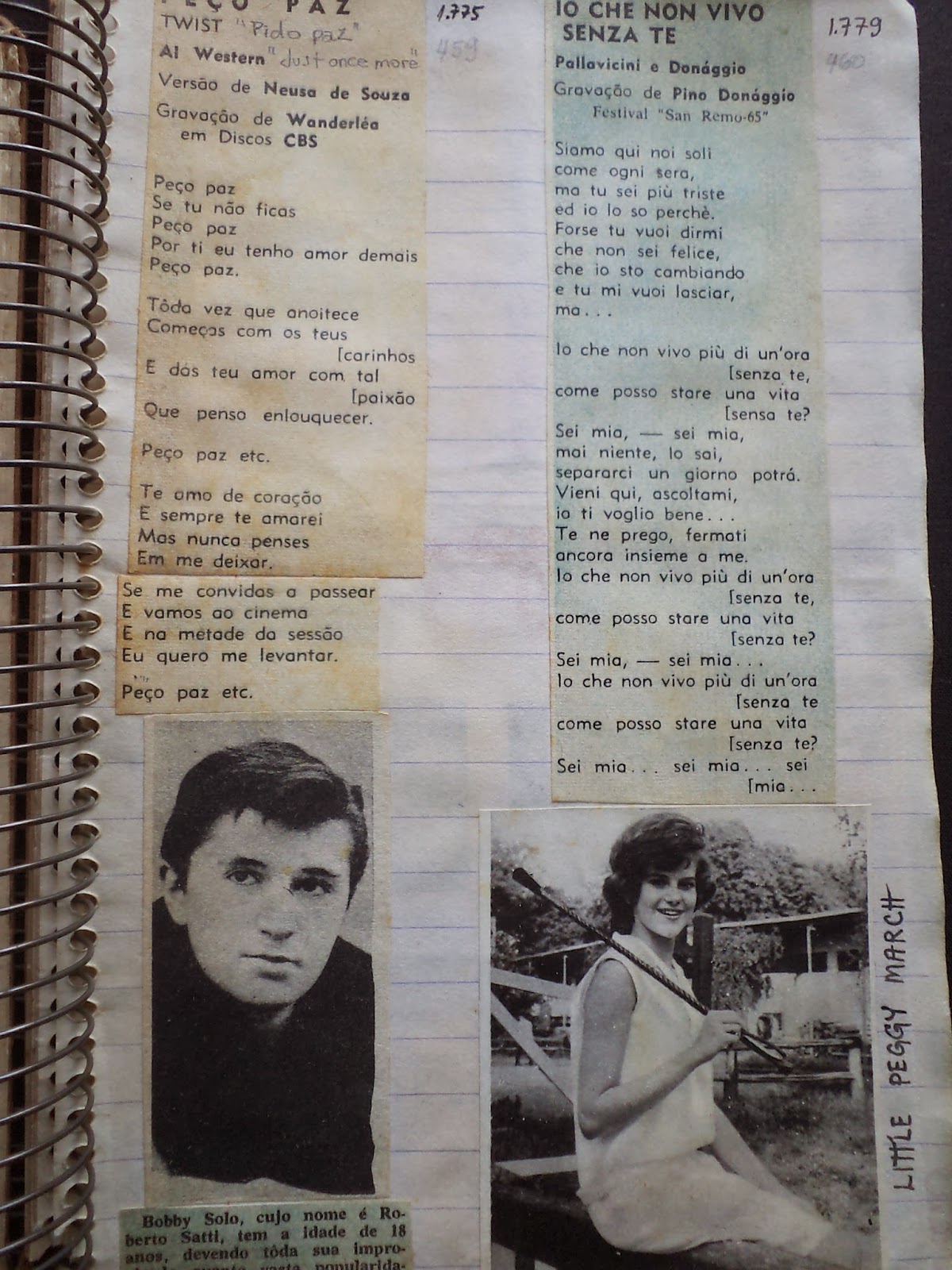 This song-book cum scrap-book belonged to Silvia Paula Jentsch, an eager music fan who fell in love with Rita Pavone in 1964, as most Brazilians did in that period. Silvia was also an avid buyer of weekly and monthly show-business magazines like 'Revista do Rádio', 'Vamos cantar' (published only lyrics), 'Modinhas populares' (only lyrics), 'Melodias' (lyrics plus articles and photos), 'Revista do Rock' (lyrics and articles), 'Intervalo' (TV guide), '7 dias na TV' (TV guide), 'Manchete', 'O Cruzeiro', 'Fatos & Fotos' etc.